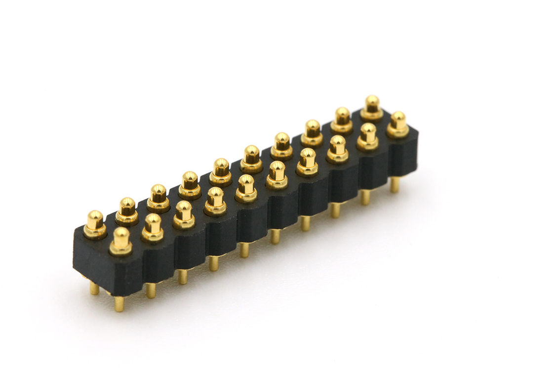 Brass gold plating double row 2*10pin DIP spring loaded connector,UPE developed 2.0mm pitch standard male and female 2pin-40pin Pogo pin connector with SMT / DIP / Right Angle / Solder Cup.